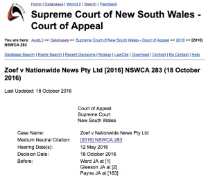 CASE UPDATE: Zoef v Nationwide News Pty Ltd – 2015, 2016 and 2017