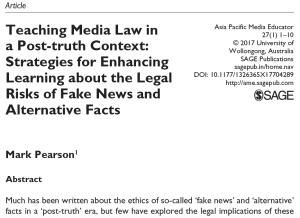 My article ‘Teaching media law in a ‘post truth context’ has just been published in the Sage journal Asia Pacific Media Educator, edited by Professor Stephen Tanner from the University of Wollongong.
