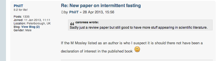 The ICMJE requirements include “dual commitments, competing interests, or competing loyalties” in their definition of conflicts of interest. Even without the book, Dr Mosley appears to have such competing interests – as the presenter of a top-rating Horizon program that popularised this diet method when in it was broadcast on BBC2 in August 2012. Dr Mosley is also on the speaking circuit, with his appearances with the JLA group advertised in the £2500-£5000 per appearance fee band and Catalyst World Class Speakers billing him in the £1000-£5000 category.