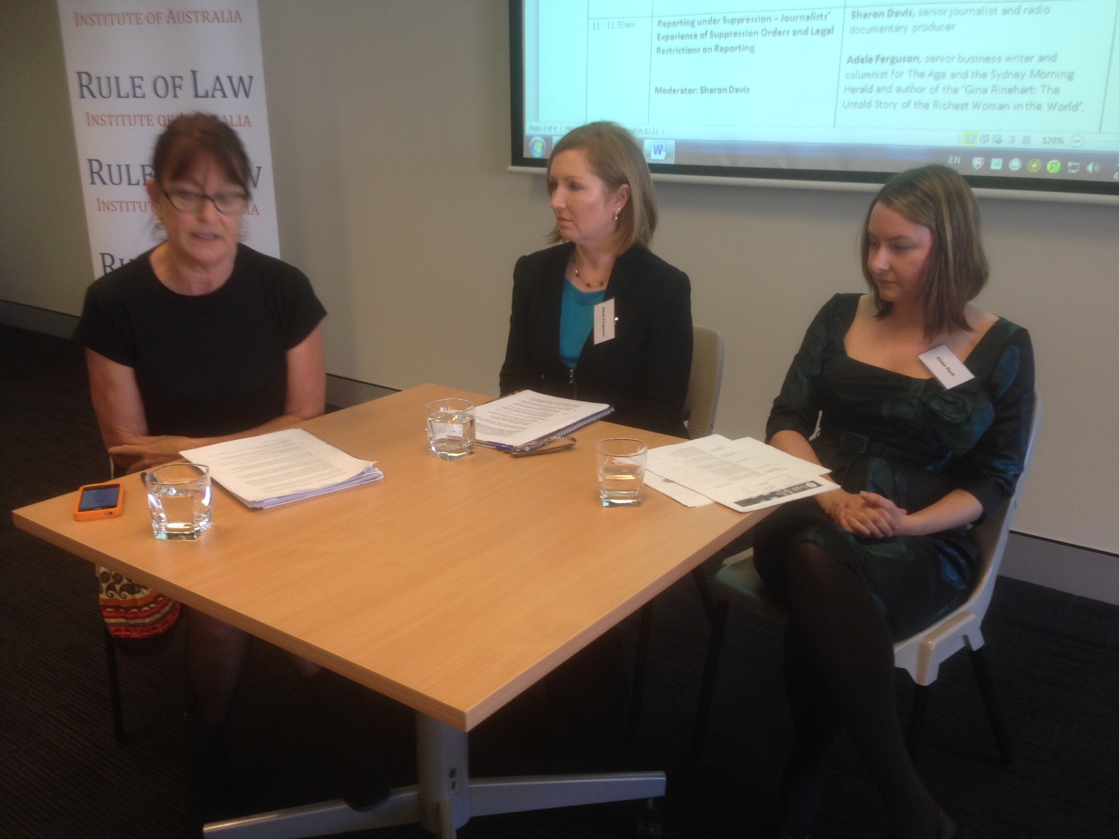 She was joined on a panel by Gina Rinehart biographer and Fairfax senior business writer Adele Ferguson (centre) who shared her courtroom experiences on reporting under suppression – and senior journalist and documentary producer Sharon Davis (left).