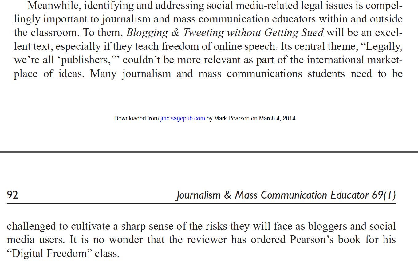 The top media law academic in the US, Professor Kyu Ho Youm, has just reviewed my recent book Blogging and Tweeting Without Getting Sued in the leading journal Journalism & Mass Communication Educator.