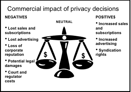 The table takes account of the fact that there may be a range of potential profits or costs resulting from a story involving a privacy intrusion, including gained or lost circulation or ratings, advertising, syndication rights, corporate reputations, legal damages, and court or regulator costs. The courts would frown upon news organizations formally weighing up the potential monetary outcomes against the intangible human damage which could be caused by a privacy invasion. That said, there is little doubt journalists go through such a process, either formally or informally, when deciding whether to run with a story which pushes the privacy margins.