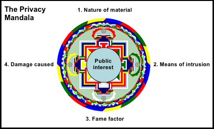 I have taken several self-regulatory codes and developed from them a more useful schema of situations, actions, and individuals which might in turn lead into a workable device for journalists (reporters, editors, news directors, and photographers) and regulatory bodies and perhaps even courts seeking to weigh up the competing privacy-public interest elements of a story. It aims to help journalists cover the main avenues of consideration when reaching their own decisions and, in turn, offer them a tool for explaining their decisions logically and systematically. I have called it the “Privacy Mandala”.